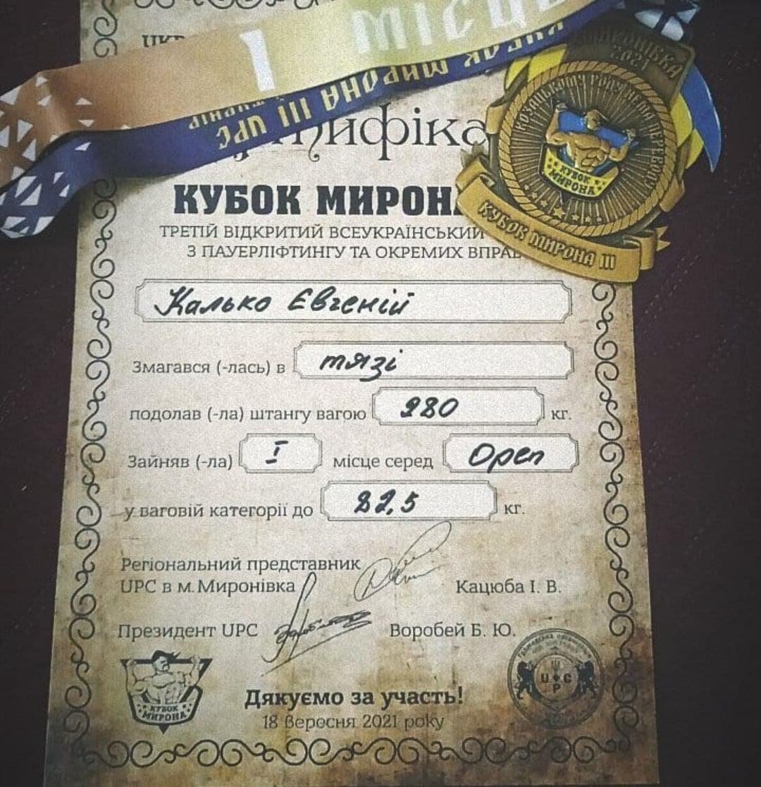 – Загалом підготовка була в експрес режимі. Після неприємних травм, було декілька тижнів на відновлення форми. Не дивлячись на все, зайняв перше місце у ваговій категорії 82,5 кг. Не кращий мій результат, але в даній ситуації це добре. Змагання були на високому рівні, під егідою федерації UPC. Це було важко, але захоплююче, не дивлячись на все, після двох невдалих спроб, із нульовою оцінкою я виходив на третю спробу із зірваними мозолями, але мотивований, що і принесло мені перемогу, – розповів Телеграфу Євгеній Калько.
