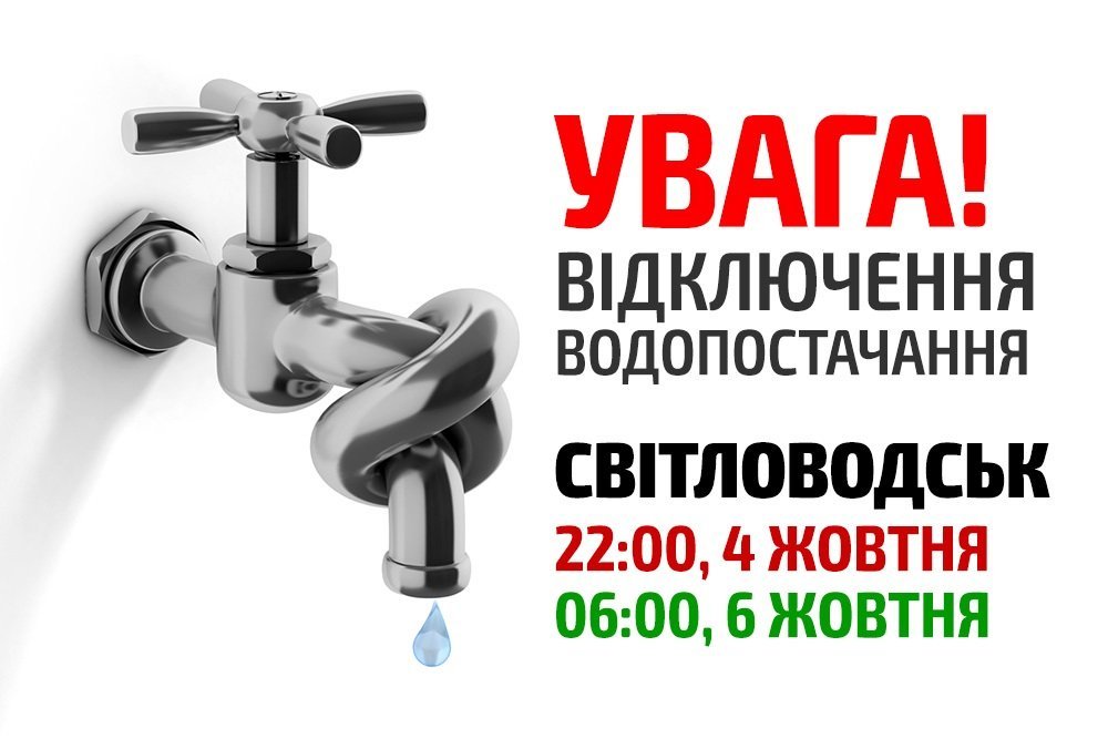 Світловодськ залишиться без води на 32 години. Про це на своєму офіційному сайті повідомляє обласне комунальне невиробниче підприємство «Дніпро-Кіровоград». Відключення відбудеться з 22:00 4 жовтня по 06:00 6 жовтня.