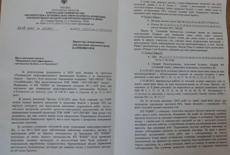 На вимогу бюджетної депутатської комісії Кременчуцької міської ради (голова Олександр Плескун) директор КП «Кременчуцька муніципальна енергосервісна компанія» (КМЕК) Вадим Качан надав інформацію про хід реалізації проєкту з енергоефективності. Нагадаємо, КМЕК є замовником робіт з утеплення у громадських закладах — і через затримки з ремонтами у місті паралізована робота 11 дитсадків.