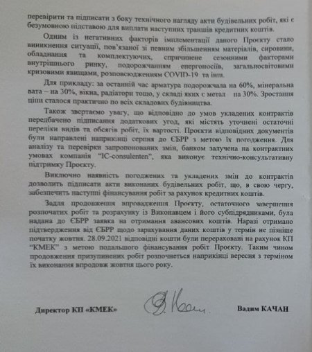 Та й кінець вересня уже настав — а чи продовжені призупинені роботи? Ні ми, ні депутати на даний час не мали можливість цього уточнити. Бо, як уже сказано, мер Малецький опирався виступу директора КМЕК на сесії. І взагалі заборонив йому давати усні коментарі журналістам.