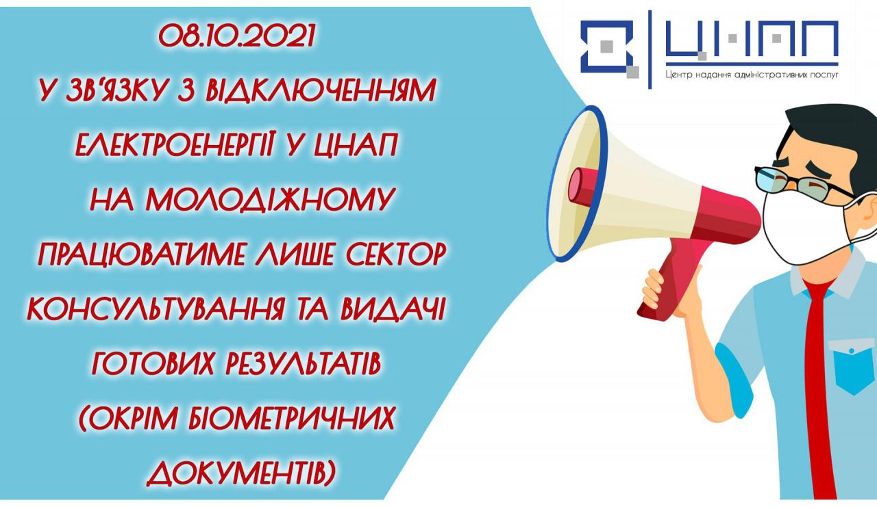 У зв’язку з відсутністю електроенергії у цей день у ЦНАПі на Молодіжному працюватиме лише сектор консультування та видачі готових результатів (окрім біометричних документів).