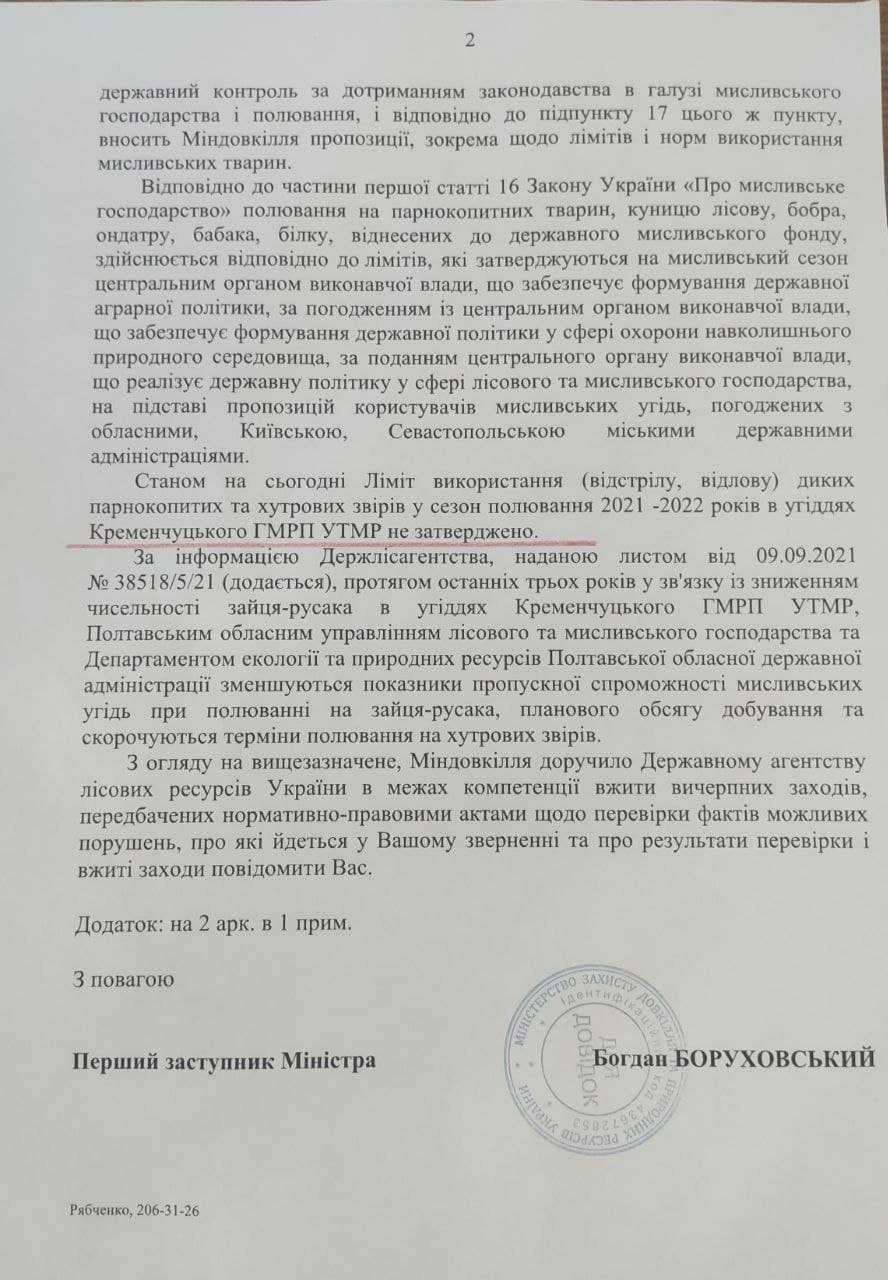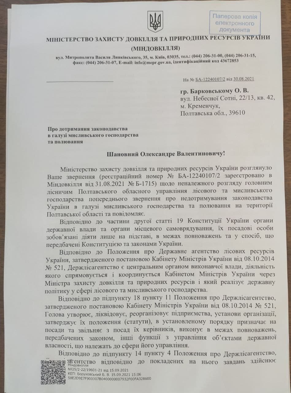 Кременчужанин Олександр Барковський звертався до Міністерства захисту довкілля із запитом про дотримання законодавства в галузі мисливського господарства та полювання.