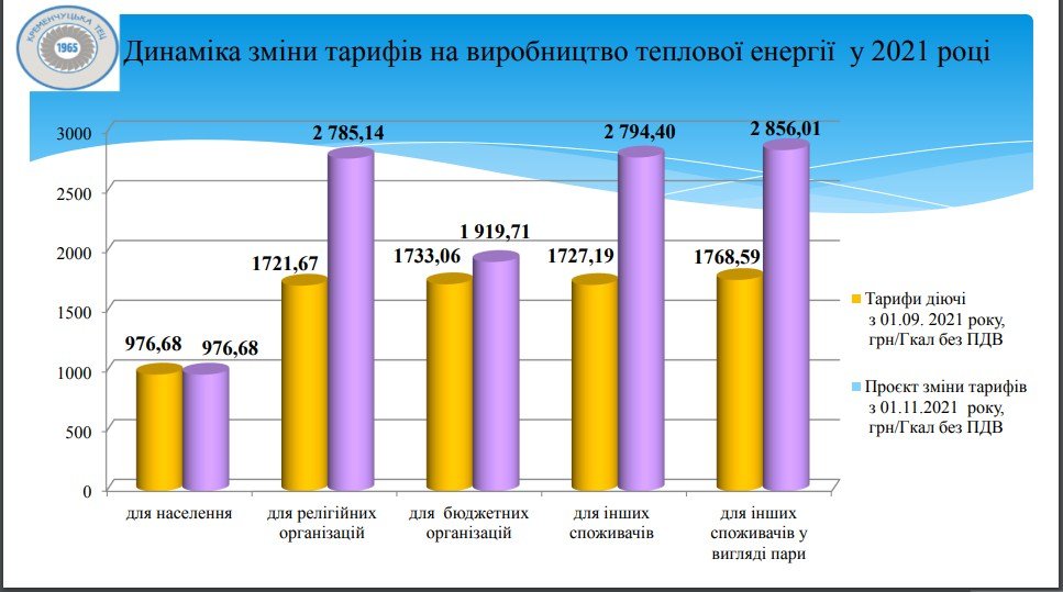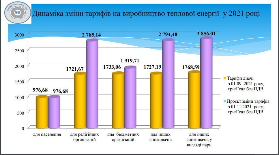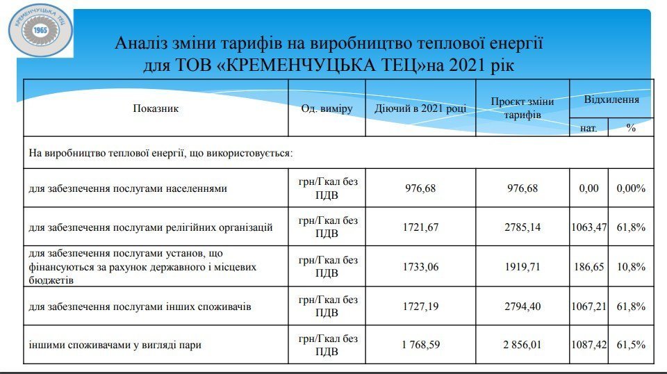 Теплова енергія для населення, яку відпускає ТОВ «Кременчуцька ТЕЦ», не подорожчає — тарифи на опалення та гарячу воду залишаться такими ж, як і зараз. Проте тарифи для релігійних організацій, інших споживачів (а це підприємці та бізнес) зростуть орієнтовно утричі (порівняно з діючими зараз). Для бюджетних організацій — удвічі. Проєкт нових тарифів на виробництво представили під час відкритих слухань 11 жовтня на ТОВ «Кременчуцька ТЕЦ». Ми говоримо зараз про порівняння діючих тарифів (а вони ще не змінювалися, їх зафіксував виконком Кременчуцької міськради до затвердження нових) із запропонованими.