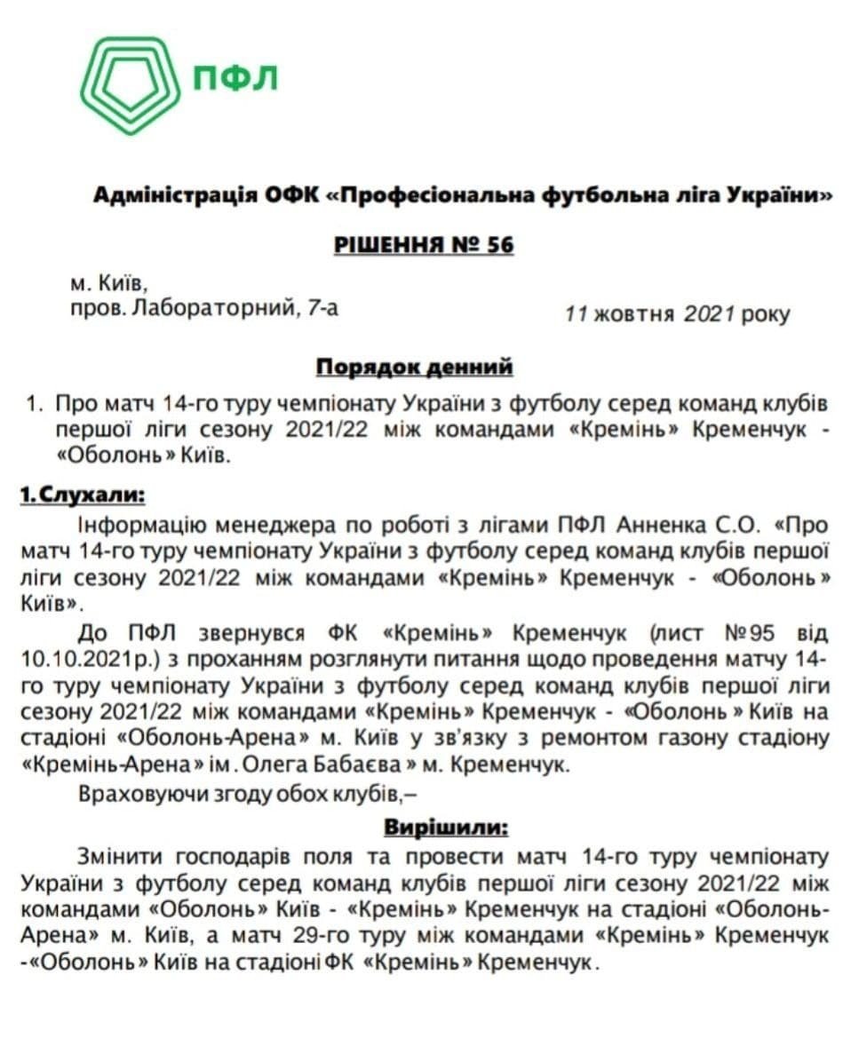 – ФК «Кремінь» звернувся до ФК «Оболонь» з проханням провести гру в Києві. Київський клуб дав згоду і було прийнято відповідне рішення про перенесення матчу в столицю України. Це нормальна практика, коли клуби домовляються між собою і клуб-гість може надати свою домашню арену.