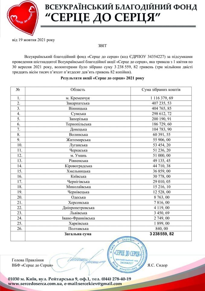 XVІ Всеукраїнської благодійної акції «Серце до серця» в Україні було зібрано 3 223 536 грн., з яких 1 116 379 грн. зібрали кременчужани.