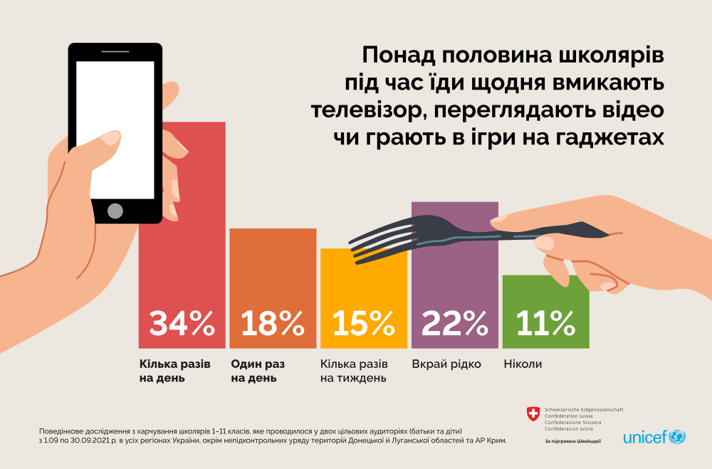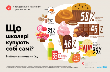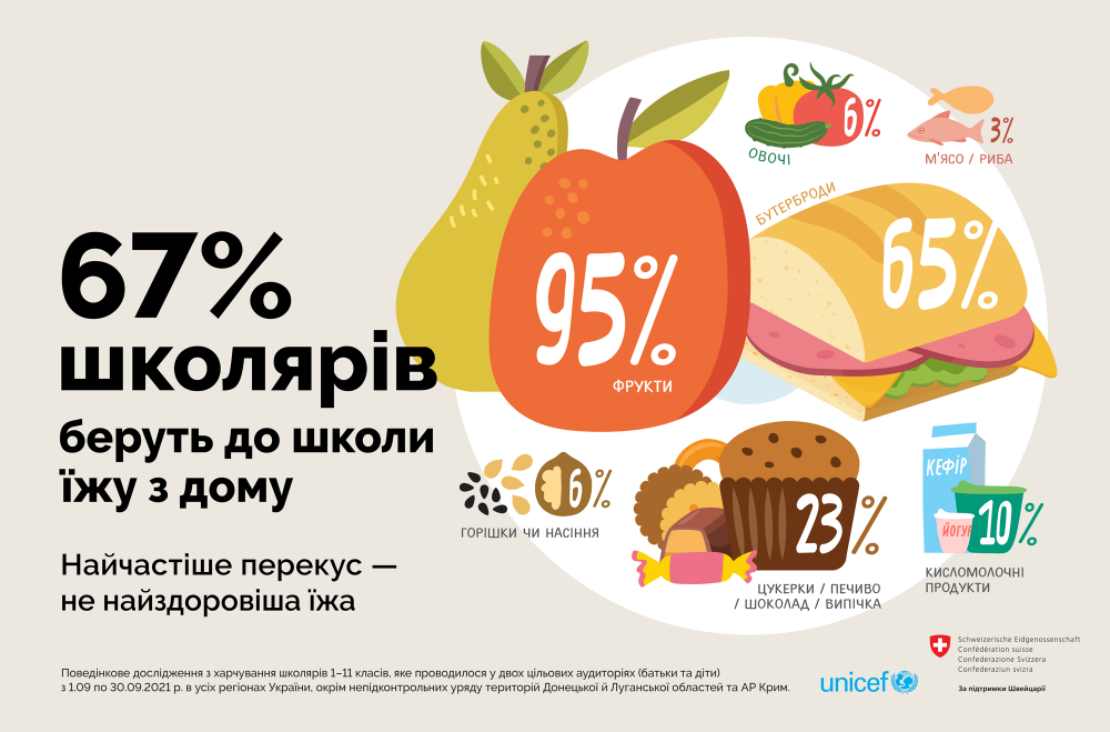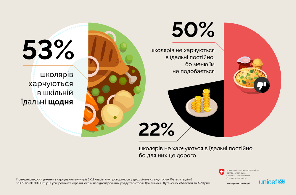 UNICEF Ukraine 16 жовтня опублікувала на своїй Facebook-сторінці результати дослідження харчової поведінки українських школярів та їхніх батьків, яке може пролити світло на реальні результати реформи шкільного харчування. Дослідження проводилося серед учнів 1-11 класів в усіх регіонах України крім тимчасово окупованих територій та Криму з 1 по 30 вересня 2021 року.