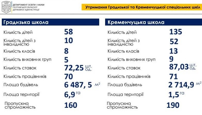 Директорка обласного департаменту освіти Віта Ковальська порівняла видатки на утримання Градизької та Кременчуцької спецшкіл. За її словами одна дитина в рік обходиться в 330 000 грн. Тому на базі Градизької спецшколи хочуть створити військовий ліцей.