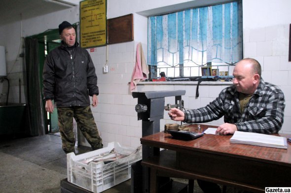 – Ляща сім кілограмів, – каже приймальник В’ячеслав, прізвища не називає. Зваживши улов, записує його в журнал обліку. Виписує накладні.