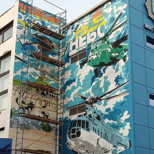- А бачили ще частину цього мурального комплексу, яка з'явилася протягом сьогоднішнього дня? Можливо й ні, бо середина тижня доволі заклопотана, тому я й зкидую вам цю світлину. Завершальну світлину цього дня. Як бачите, показався останній гелікоптер, а далі тільки небо... Бажайте гарної погоди у Klk.hnuvs та сил трохи замореному художнику) пардон, вуличному художнику, - зауважив художник.