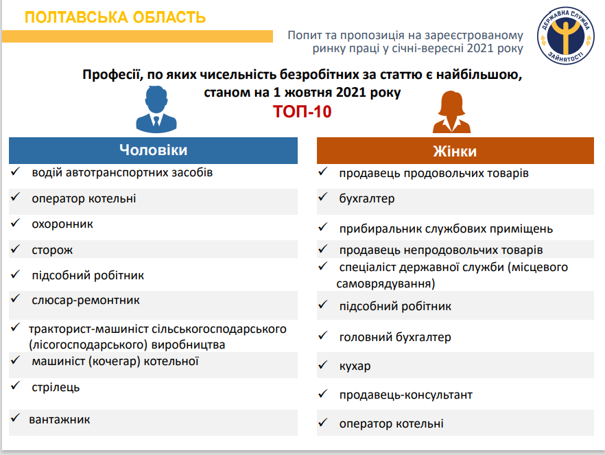 Станом на 1 жовтня 2021 року послуги Полтавської обласної служби зайнятості отримували 14,4 тис. зареєстрованих безробітних, що на 32% менше, ніж на відповідну дату минулого року.