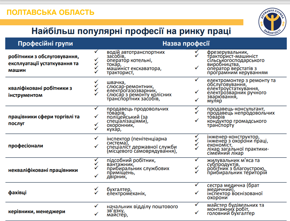 Нестача кадрів спостерігалася серед представників таких професій: швачка, поліцейський (за спеціалазаціями), токар, машиніст екскаватора, інспектор (пенітенціарна система), фрезерувальник.