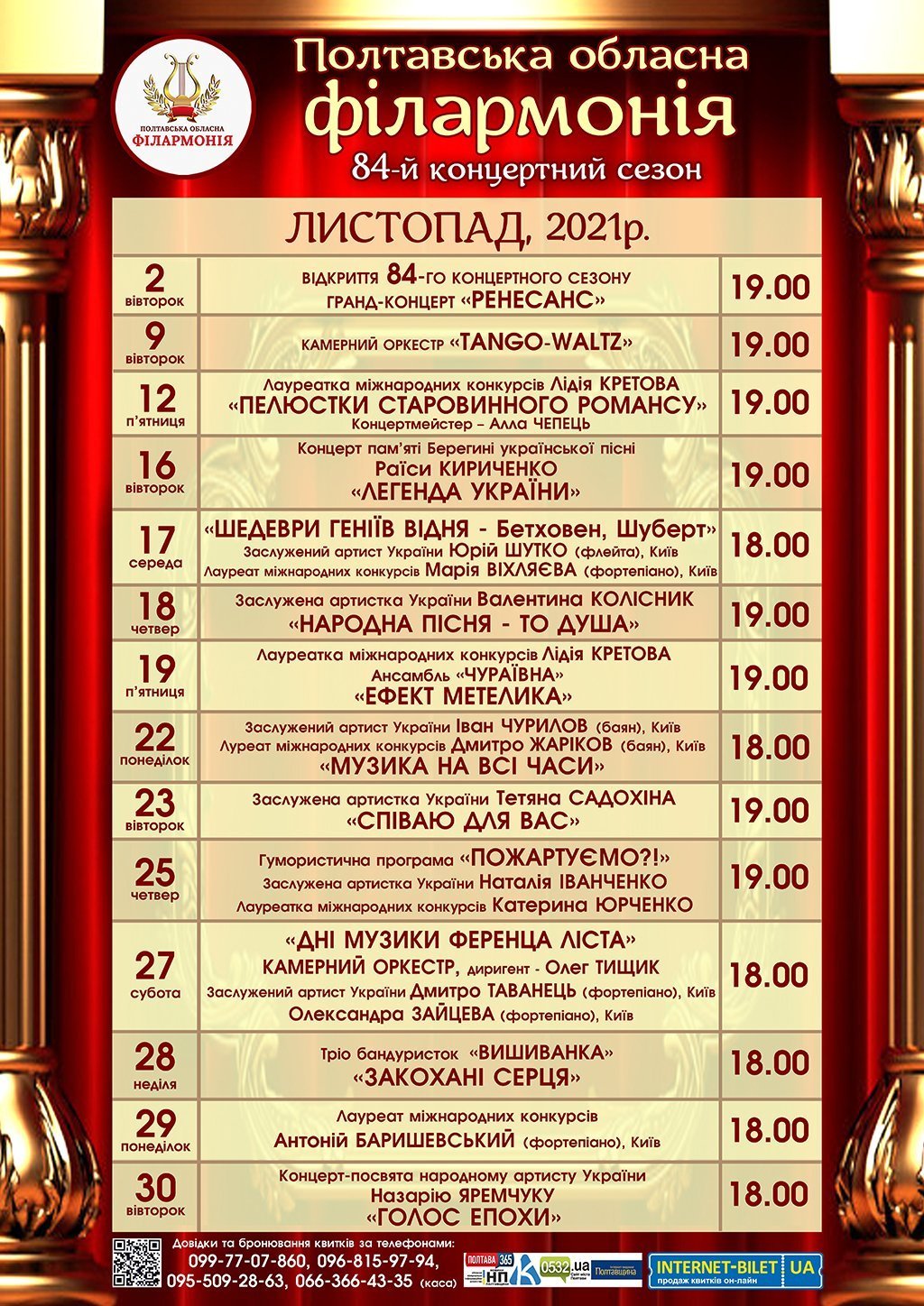 Полтавська обласна філармонія, яку відкрили 22 жовтня після реконструкції, оголосила про початок 84-го концертного сезону та оприлюднила афішу на листопад 2021 року.