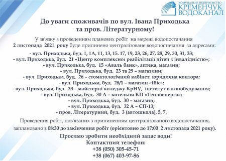 КП «Кременчукводоканал» планує 2 листопада виконати заміну засувки вулиці Івана Приходька, буд. 15.
