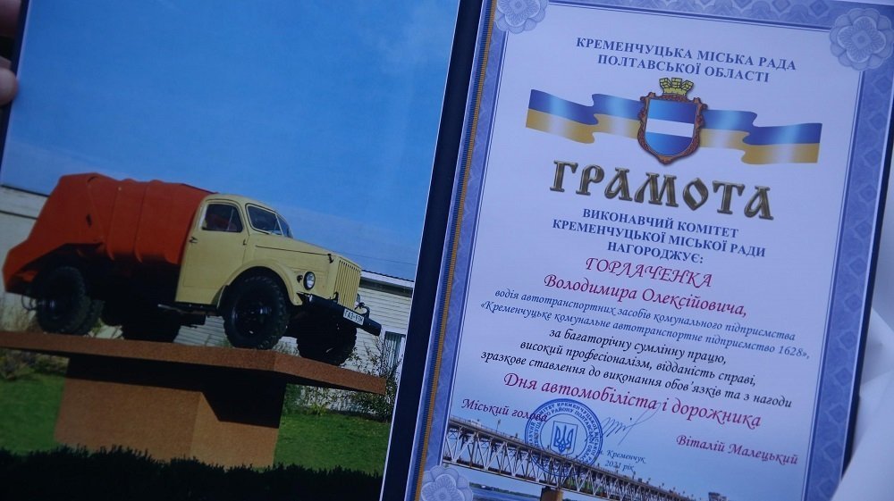Коли автомобіль встановлювали на п’єдестал водій сміттєвозу «ГАЗ» не одразу впізнав свою бойову подругу. Володимир Горлаченко після армії у 1977 році перетнув поріг комунального підприємства й майже півстоліття робить Кременчук чистим та охайним. Водій поділився, що на початку працював на такій же моделі сміттєвоза, проте у 1982 році отримав нового друга з яким не розлучався аж 38 років! До жовтня 2020 року. За цей час змінилося все: від викиду сміття у відрах, коли люди чекали приїзду сміттєвозу до появи сміттєвих контейнерів та майданчиків. Володимир з чотириколісним другом вивозили сміття з території будинків та магазинів, а останнім часом обслуговували приватний сектор.
