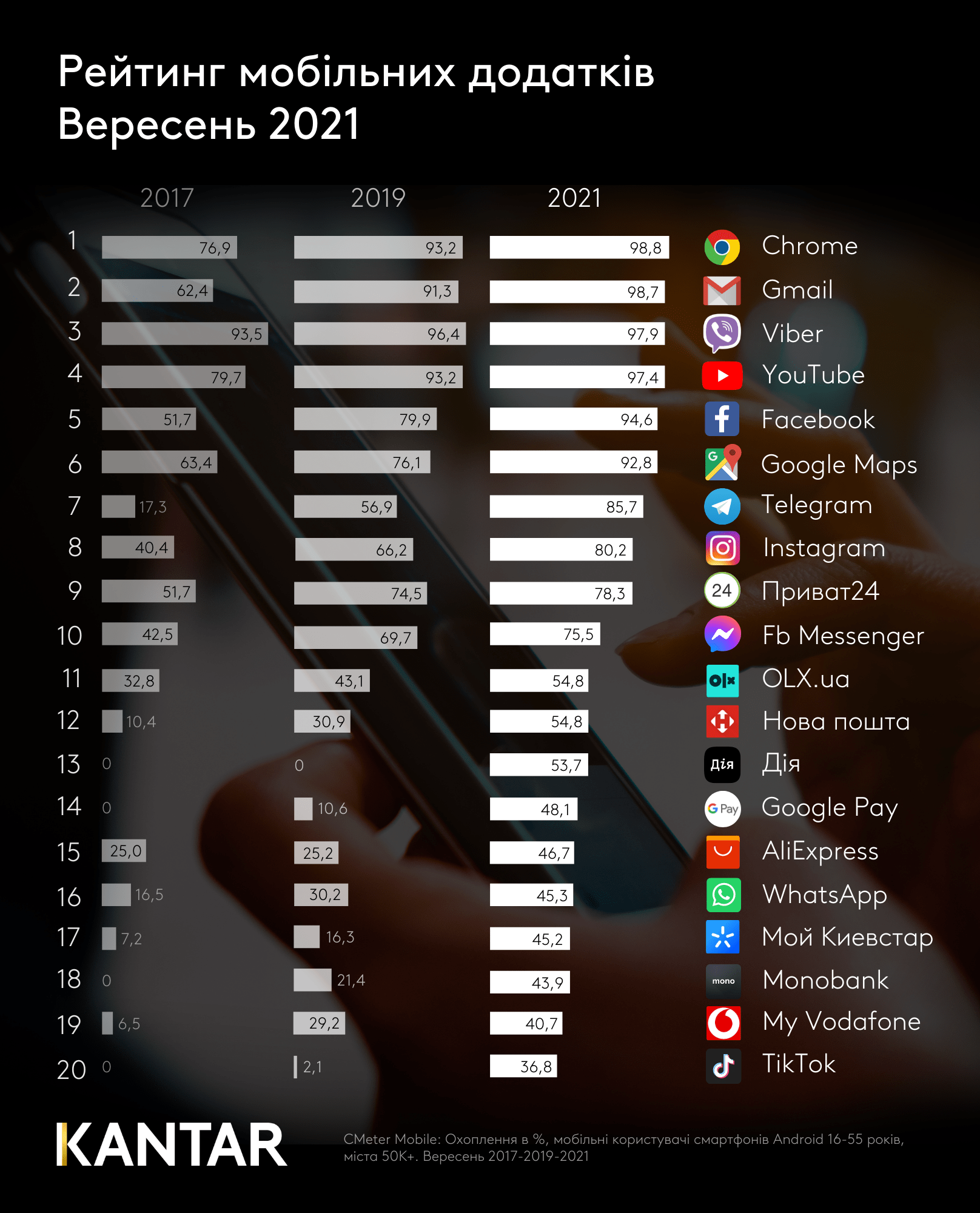 У вересні українці проводили час в соціальних мережах та месенджерах, переглядали відео в YouTube, а також вирішували свої буденні справи: від розміщення оголошень на OLX та та відстеження посилок через Нова Пошта до оплат телефоном та формування електронних Covid-сертифікатів. Про це свідчать дані проєкту Kantar CMeter.