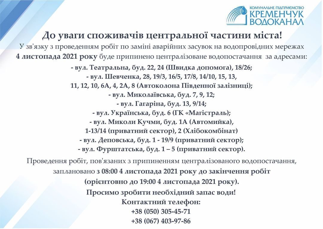 «Кременчукводоканал» планує 4 листопада виконати роботи з заміни засувок на перехресті вулиць Шевченка й Української та заміну на перехресті вулиць Небесної Сотні й Української.