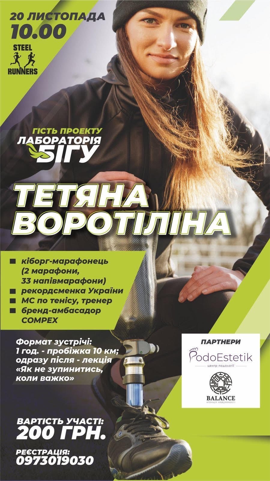 20 листопада в рамках проєкту «Лабораторія бігу» відбудеться зустріч зі спортсменкою-кіборгом Тетяною Воротіліною. Майстер спорту здолала 2 марафони, 33 напівмарафони, 1 трейл на 29 км, жінка також реабілітолог та рекордсменка України.