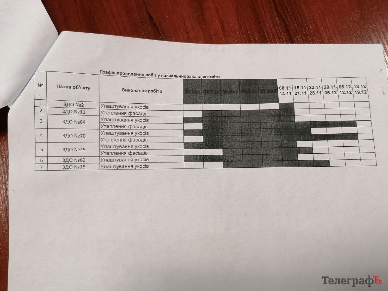 5 листопада на спільному засіданні депутатських комісій до рук журналістів Телеграфа потрапив графік завершення ремонтів у кременчуцьких дитсадках. Трохи раніше під мерією батьки змусили мера підписати такий же.
