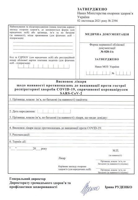 Відповідну форму «Висновок лікаря щодо наявності протипоказань до вакцинації проти гострої респіраторної хвороби COVID-19, спричиненої коронавірусом SARS-CoV-2» та інструкцію щодо її заповнення затвердили наказом № 2394 від 2 листопада 2021 року.
