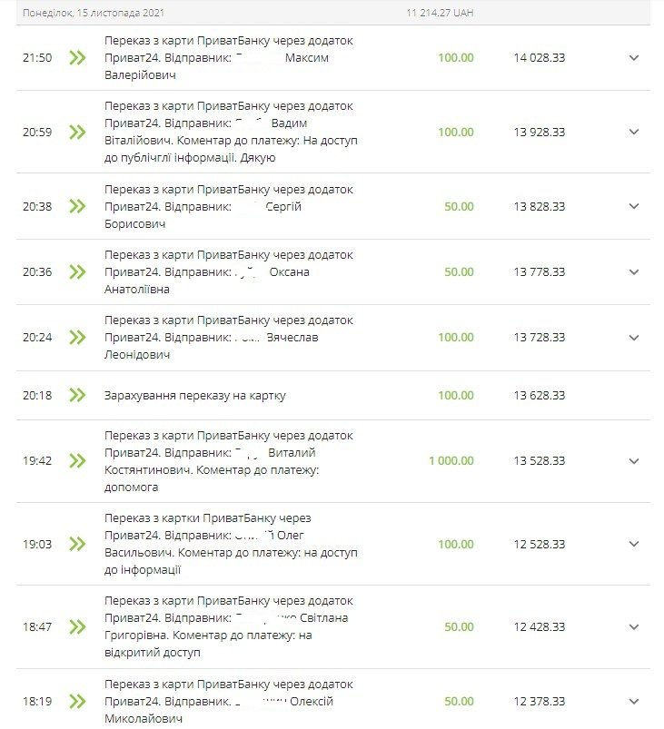Учора, 15 листопада, я — випускова редакторка «Телеграфа» Тетяна Донченко (Волинська) опублікувала пост про суд за доступ до публічної інформації. Минуло шість годин — а ми вже мали гроші на судовий збір (908 грн), і навіть більше — кременчужани в цілому пожертвували на доступ до правди 1700 гривень, і збір ми припинили (про це я оголосила того ж дня, доповнивши свій пост). Ось гроші, які надійшли (поважаючи приватність, ми прибрали прізвища платників).