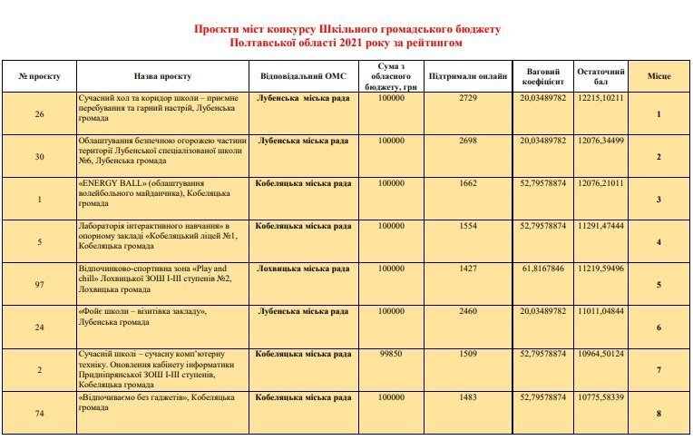 Наразі робоча група затвердила перелік проєктів-переможців Шкільного громадського бюджету Полтавської області 2021 року.