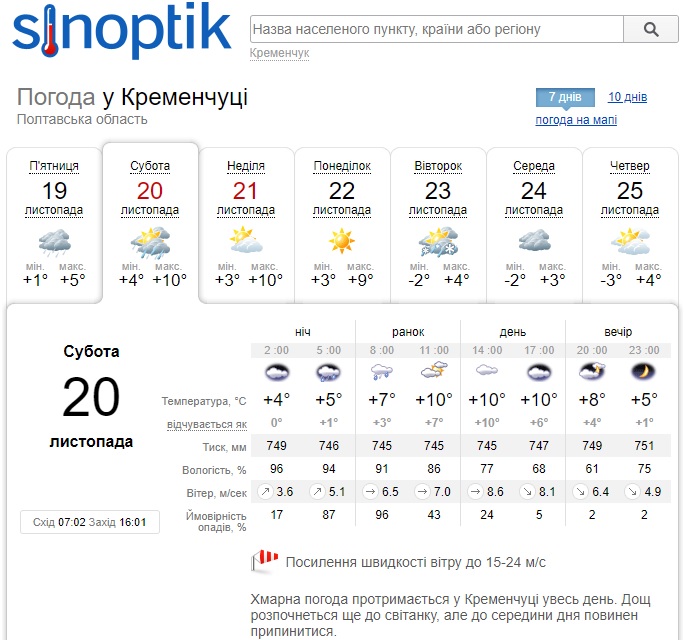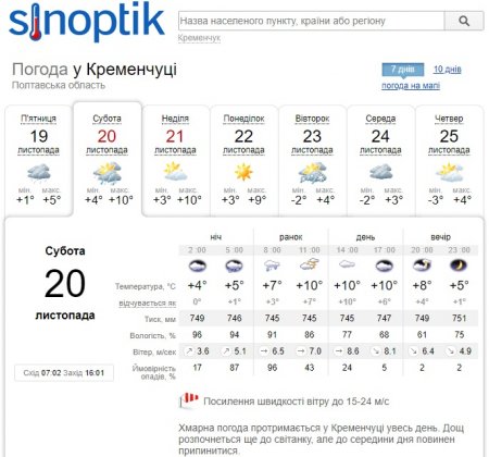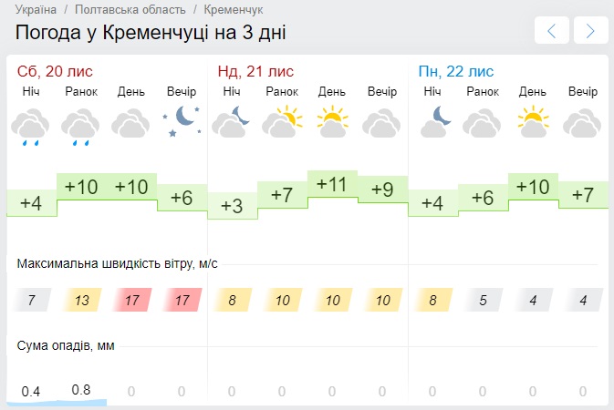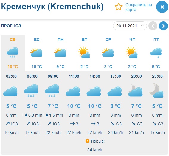 Зранку та у першій половині дня 20 листопада по Полтавській області, зокрема у Кременчуці, очікуються пориви північно-західного вітру 15-20 м/с. За повідомленням Полтавського обласного центру з гідрометеорології, оголошене штормове попередження (перший рівень небезпечності – жовтий). Крім того, у суботу у місті дощитиме, зате потеплішає.