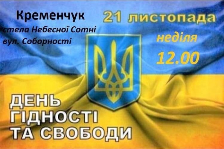 Кременчужан запрошують долучитися до відзначення Дня Гідності та Свободи і вшанувати Героїв сучасної України. Захід відбудеться завтра, 21 листопада, біля стели Небесної сотні на вулиці Соборній. Початок о 12.00.