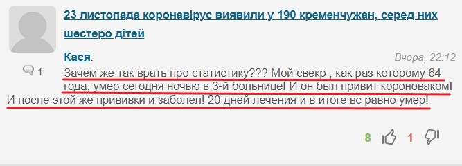 З початку вакцинальної кампанії, багато наших читачів підозрювали міську владу в тому, що вона умисно не дає у статистиці кількість ушпиталених і померлих кременчужан, які були вакциновані. І ось, 28 жовтня, їх прохання нарешті взяли до уваги і у щоденній статистиці стали зазначати, скільки вакцинованих серед ушпиталених і померлих. Зазначимо, що з того часу у статистиці жодного разу не було випадку смерті вакцинованого. Це обурило кременчужан ще більше - вони переконані, що такі випадки просто замовчуюються.