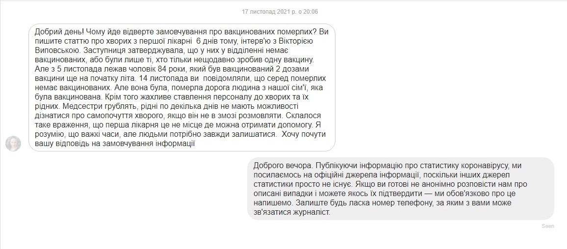 Проблема у тому, що не було ще жодного читача, який би погодився надати нам докази таких випадків. На запитання щодо статистики у влади завжди одна і та ж відповідь - вона вірна, серед померлих вакцинованих не було. Щоб довести протилежне, необхідно розбирати кожен окремий випадок. Для цього необхідно мати персональні дані такої людини. Родичі, зазвичай, не згодні їх давати.