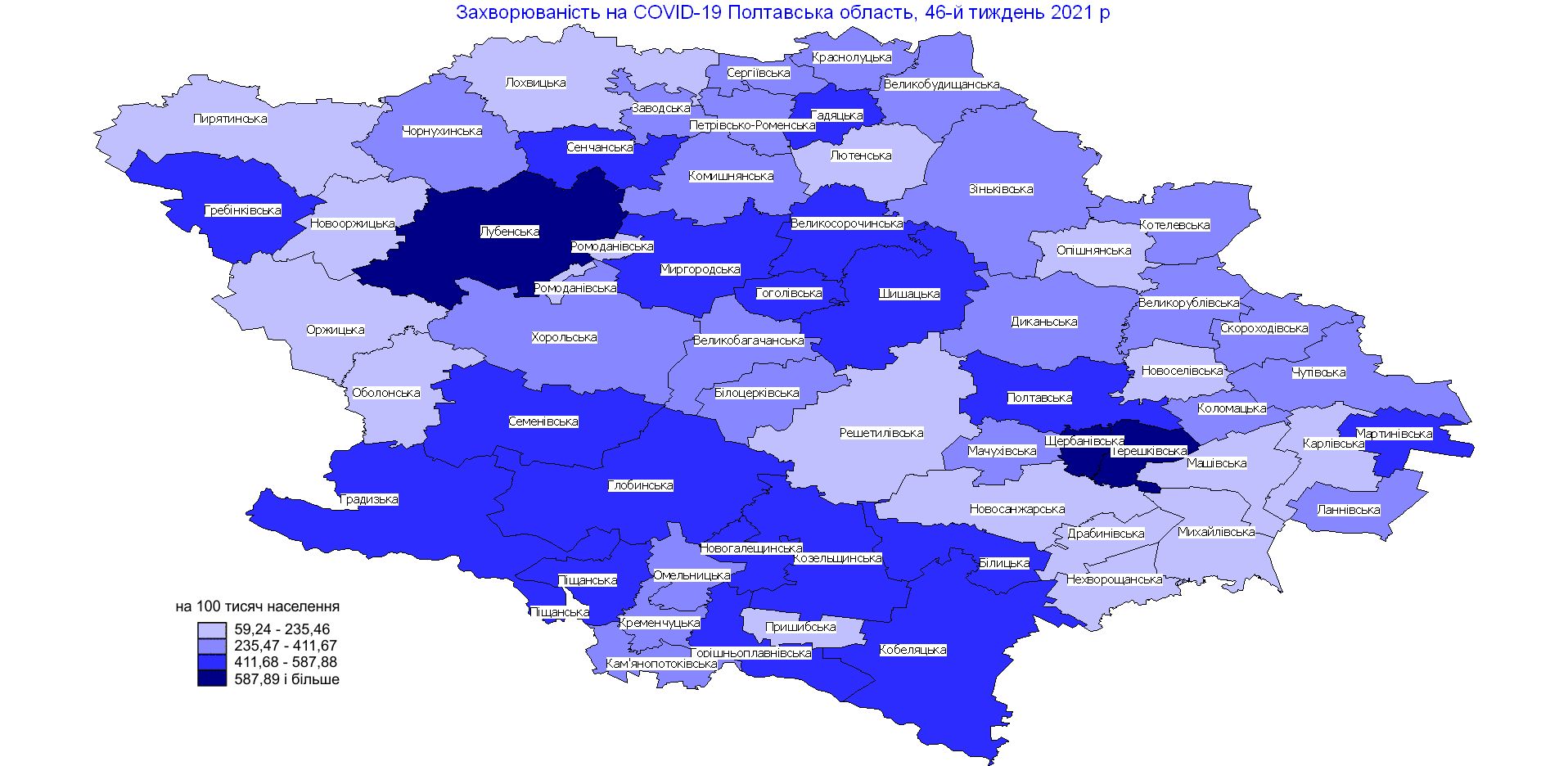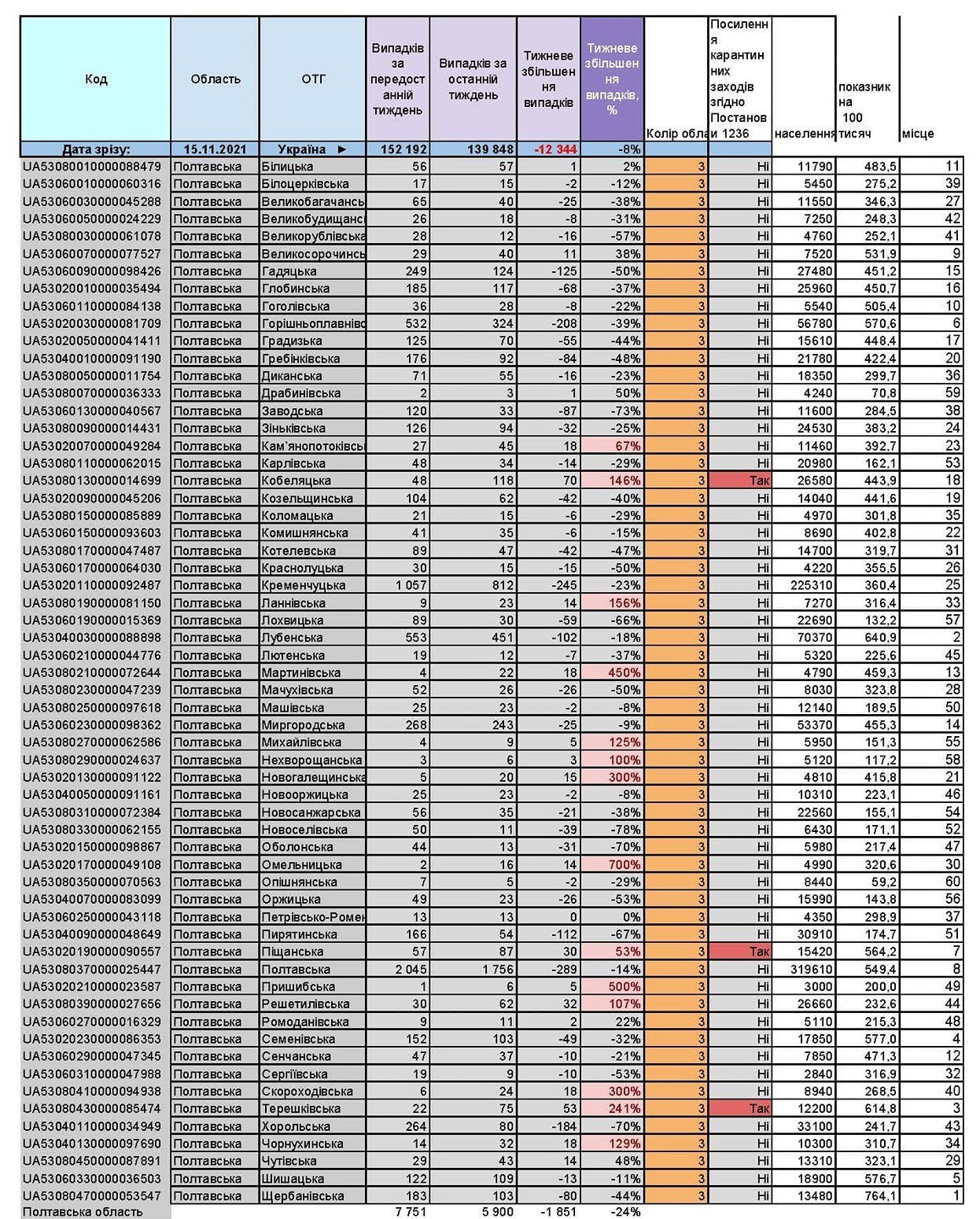 - тож захворюваність на 100 тисяч населення у Кременчуці становить 707,3, у Плавнях – 1160,4, у Полтаві – 1494,4;