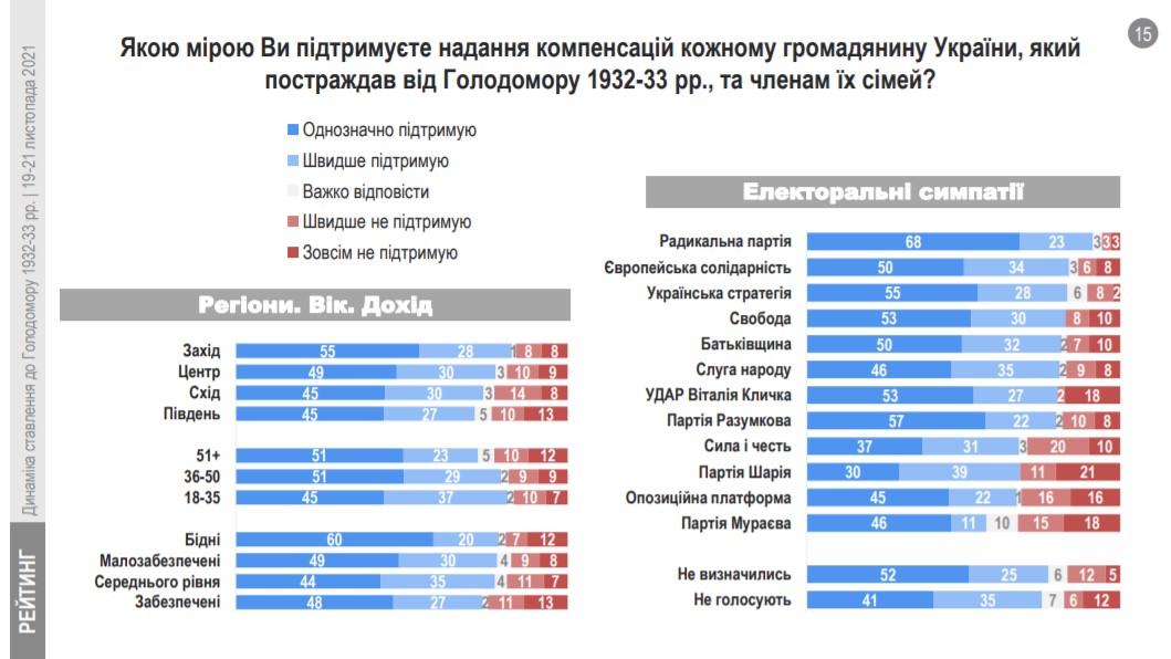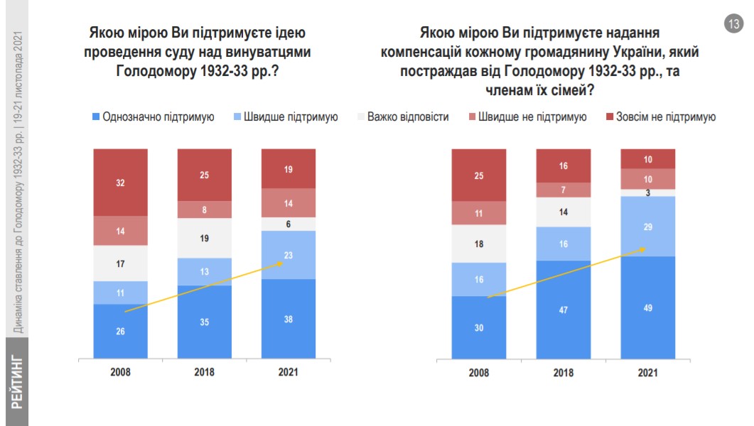 За останні роки зростає рівень підтримки ідеї проведення суду над винуватцями Голодомору 1932-33 рр.: у 2008 – 37%, 2018 – 48%, 2021 – 61%. Також позитивну динаміку має рівень підтримки ініціативи щодо надання компенсацій постраждалим від геноциду та їх сім’ям: у 2008 – 46%, 2018 – 63%, 2021 – 78%. Ініціатива щодо проведення суду над винуватцями геноциду користуються більшою підтримкою на Заході та у Центрі. Натомість ідея щодо виплати компенсацій родинам, що зазнали страждань від Голодомору користується приблизно однаковою підтримкою у всіх регіонах країни.
