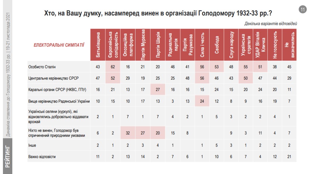 Найчастіше опитані вважають винним в організації Голодомору особисто Й.Сталіна – 44% (у 2018 році таких було 47%, 2008 – 43%) та загалом центральне керівництво СРСР – 41% (у 2018 – 39%, 2008 – 38%). Ще 17% (у 2018 – 28%, 2008 – 23%) покладають вину за геноцид на каральнi органи СРСР (НКВС, ГПУ), 12% (у 2018 – 23%, 2008 – 17%) – на вище керівництво Радянської України. Лише 3% зазначили, що у Голодоморі винні українські селяни (куркулі), які відмовлялися добровільно віддавати врожай. Тези про те, що Голодомор був зумовлений природними причинами, дотримуються 10% (у 2018 – 5%, у 2008 році – 11%).