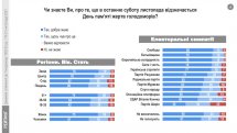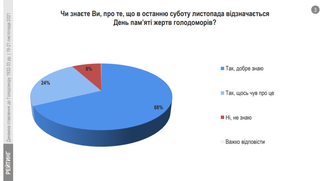 Згідно результатів опитування, проведеного Соціологічною групою «Рейтинг», 68% громадян зазначили, що добре знають про те, що в останню суботу листопада відзначається День пам’яті жертв голодоморів в Україні.