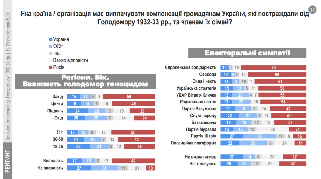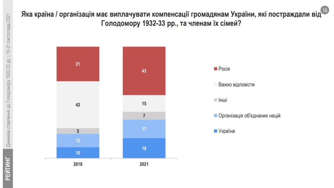 3 31% до 43% зросла кількість тих, хто вважає, що виплачувати компенсацiї громадянам України, якi постраждали вiд Голодомору 1932-33 рр., та членам їх сiмей, має Росія (у 2018 – 31%, у 2018 – 43%). Також зросла і кількість тих, хто вважає, що фінансові зобов’язання перед родинами потерпілих мають нести держава Україна (2018 – 10%, 2021 – 18%), або Організація об’єднаних націй (2018 – 12%, 2021 – 17%). Тих, хто вважає, що виплачувати компенсації має Росія найбільше на Заході, серед старшого покоління, виборців партій «Європейська солідарність» та ВО «Свобода». Натомість на Півдні та Сході покладають ці можливі фінансові зобов’язання як на Росію, так і ООН, та державу Україна. Кожен четвертий-п’ятий у південно-східних регіонах вагався з відповіддю на це питання.