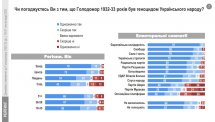 85% зазначили, що погоджуються з твердженням, що Голодомор 1932-1933 років був геноцидом Українського народу. 13% – заперечують це. Останніх найбільше на Сходу та Півдні (кожен четвертий-п’ятий опитаний у цих макрорегіонах), серед виборців партій «Опозиційна платформа – За життя», партії Мураєва «Наші», партії Шарія.
