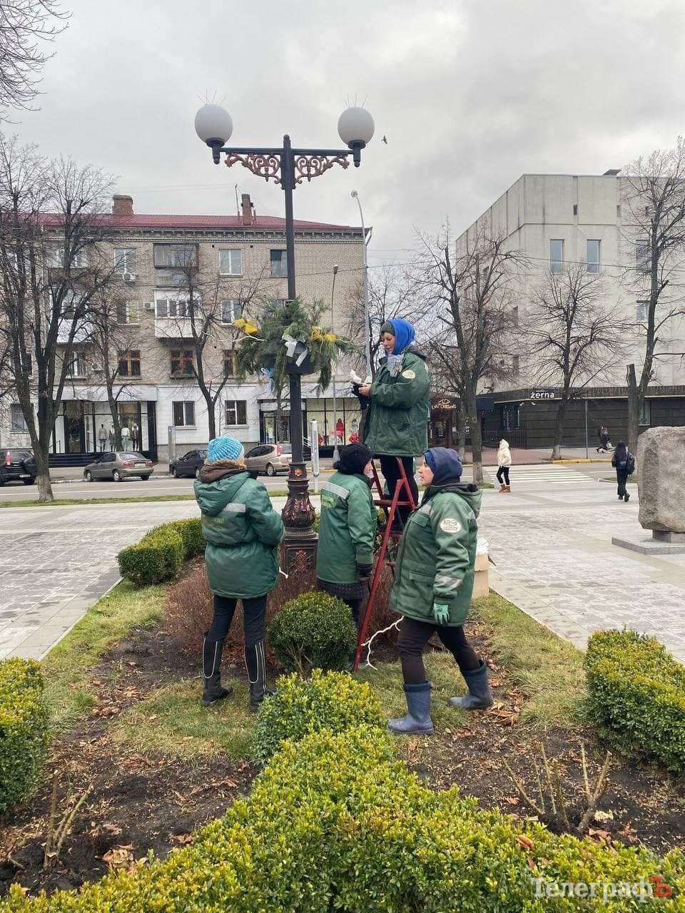 Т помітив, як комунальники вдень прикрашали локацію святковою атрибутикою – вже встигли вбрати ялинки, ліхтарі та будиночок вартових новорічної краси, які охоронятимуть сквер взимку.
