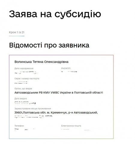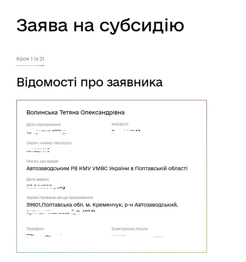 Далі «Дія» приведе на заявку з оформлення субсидії: потрібно буде зробити 21 крок до мети. (Ми не робили, лише подивилися на початку, як це працює.) Дані про заявника (ПІБ, паспорт, адреса, телефон, мейл підтягуються через «Дію» - їх вже не треба заповнювати.