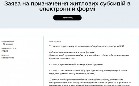 ТЪ перейшов у новий розділ, де можна подати заявку на субсидію (треба обрати зі списку послуг). На сайті є детальний опис послуги. Вказано, що оформлення заявки займе 30 хвилин. Очікувати рішення про призначення (чи не призначення) субсидії — 30 днів.