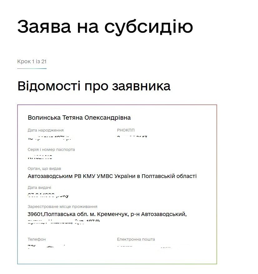 Далі «Дія» приведе на заявку з оформлення субсидії: потрібно буде зробити 21 крок до мети. (Ми не робили, лише подивилися на початку, як це працює.) Дані про заявника (ПІБ, паспорт, адреса, телефон, мейл підтягуються через «Дію» – їх вже не треба заповнювати.
