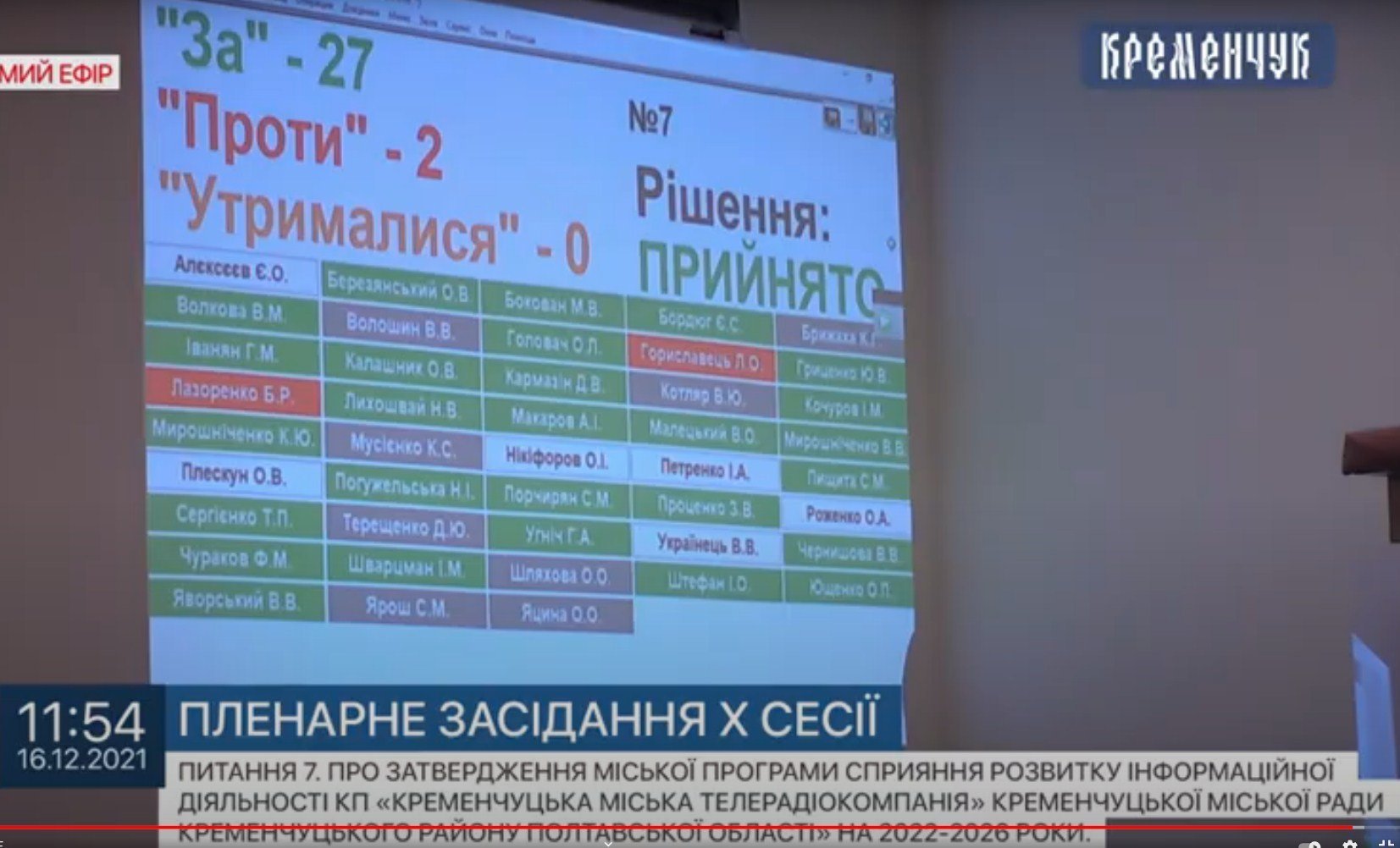 Результат: 28 — за програму КТРК на 24 мільйона, 2 (Гориславець та Лазоренко — проти), 1 (Котляр, фракція ЄС) — утримався. Шість депутатів (Плескун, Роженко, Алєксєєв, Нікіфоров, Петренко, Українець) не голосували. Частина депутатів була відсутня , онлайн доєдналися Брижаха (за) та Котляр, їх голосів на екрані ми не бачимо, але вони оголосили про свій вибір.