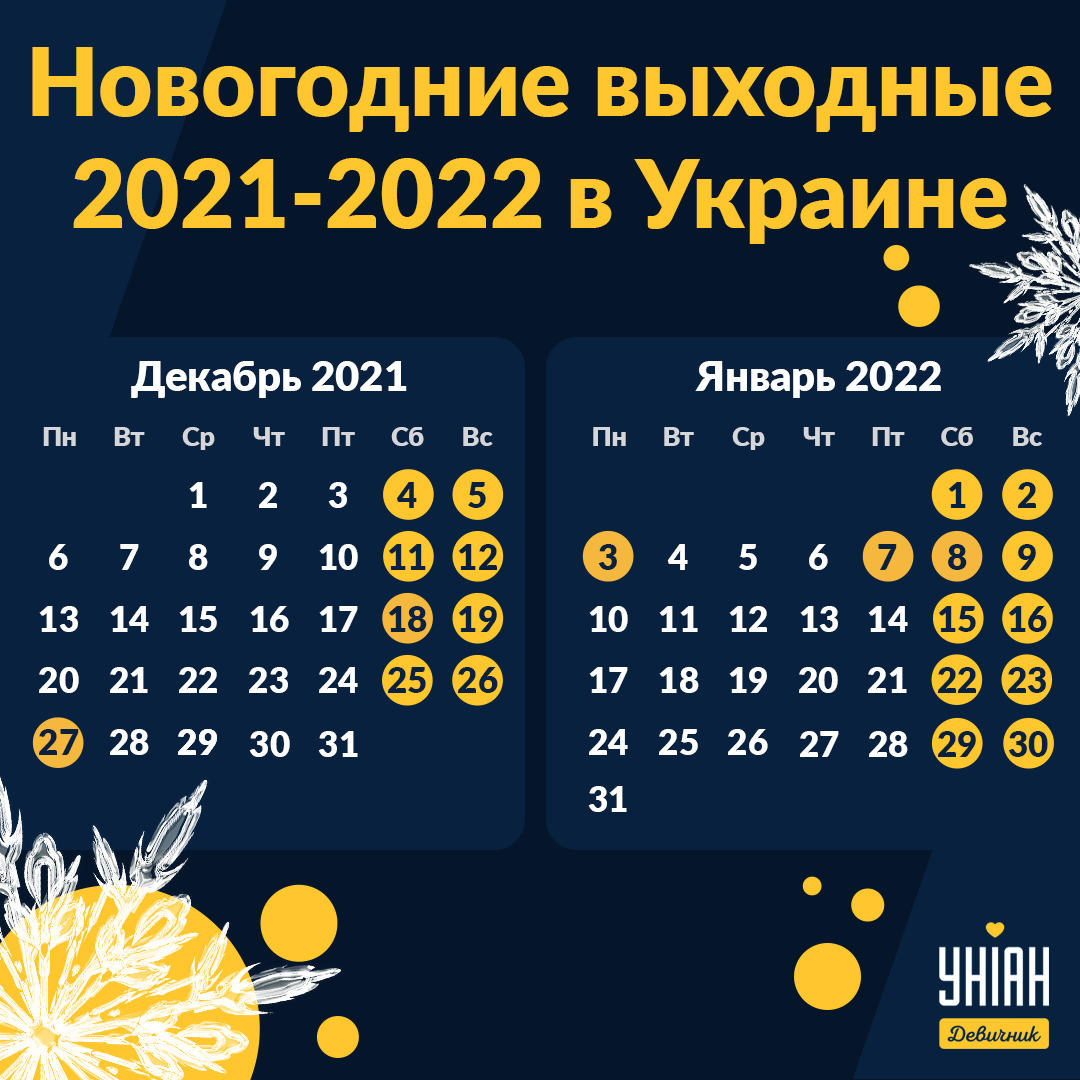7 січня Різдво відзначать православні християни. У 2022 році воно випадає на п’ятницю, так що вихідний не переводиться. Таким чином вихідні на православне Різдво триватимуть з 7 по 9 січня. А в перший тиждень січня ми будемо працювати лише 3 дні.