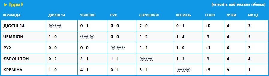«Кремінь» грав у групі F, де наші хлопці вийшли у Golden League з першого місця. Вихованці Євгена Маринича перемогли ДЮСШ-14 Київ з рахунком – 1:0, «Чемпіон» – 4:1, «Єврошпон» – 3:1 та поступився «Руху» – 0:1.