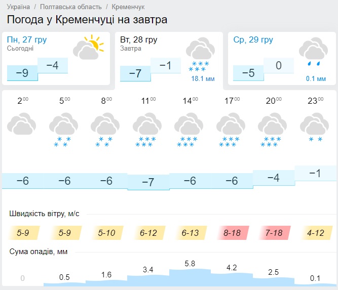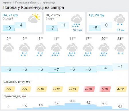 За прогнозами синоптиків, завтра у Кременчуці увесь день валитиме сніг. Та і температура буде не надто комфортною – до -7 градусів морозу.