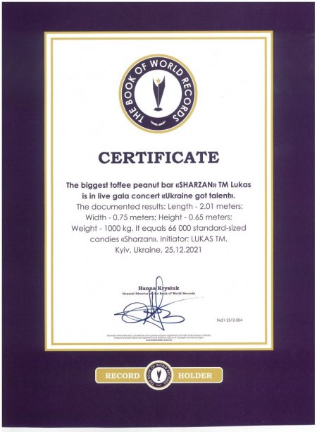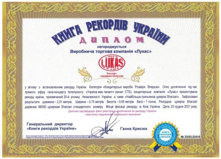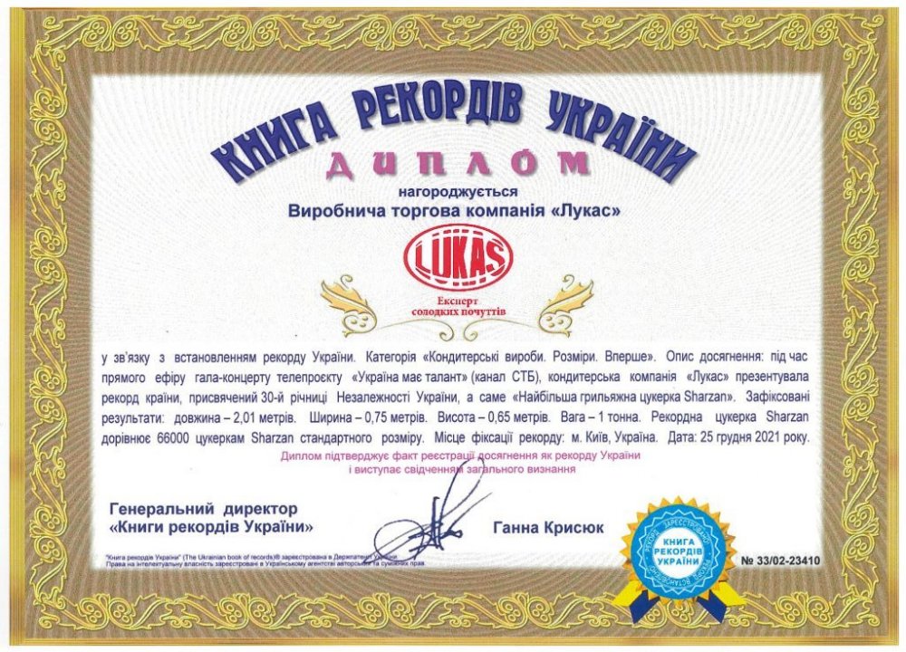 Це стало 12-м українським та 1-м світовим рекордом, встановленим кондитерською компанією. Рекорд зафіксували Людмила Боталова, креативна директорка компанії «Лукас», Ганна Крисюк, генеральна директорка Книги рекордів України, засновниця Книги світових рекордів, та Григорій Решетник, ведучий СТБ.