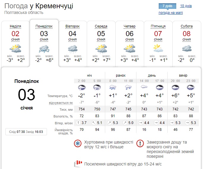 Вночі 3 січня по Полтавській області, зокрема, у Кременчуці, синоптики обіцяють значний сніг, хуртовини, на дорогах утримається ожеледиця. Про це повідомляє Полтавський обласний центр з гідрометеорології.