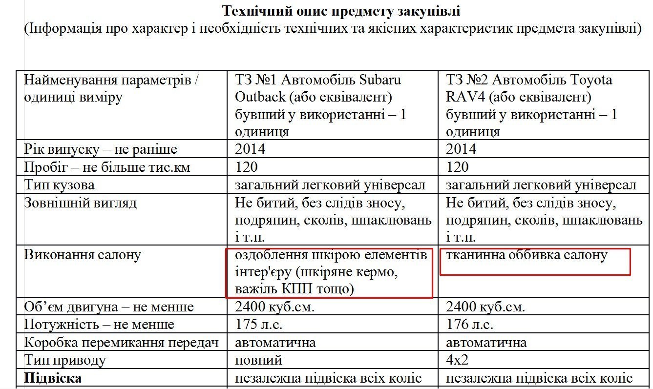 Цікаво й те, наскільки ретельно (до дрібниць) замовник прописав технічні параметри вживаних автівок у вимогах до предмету закупівлі. Для Subaru знадобилося оздоблення шкірою елементів інтер’єру (шкіряне кермо, важіль КПП). Ну, от, ніяк не можна обійтися без шкіряного керма! А от вимоги до Toyota були скромнішими: достатньо оббивки з тканини. Фари у Subaru — обов`язково ксенонові, а в Toyota – галогенні. Так само по-різному прописані вимоги до клімат-контролю, аудіосистем…