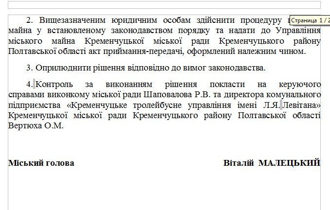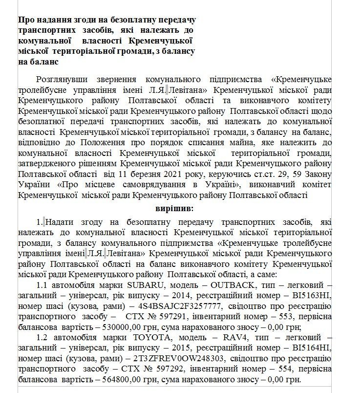 І їх купили! У нас майже не було сумнівів у тому, що бідне КТУ, яке весь час дотується з міського бюджету і двічі підвищило ціну на проїзд для пасажирів (із 2 до 8 грн), придбало автівки не собі. Так воно і є. 4 січня на сайті міської ради з’явився проєкт рішення виконкому: «Про надання згоди на безоплатну передачу транспортних засобів, які належать до комунальної власності Кременчуцької міської територіальної громади, з балансу на баланс». Виявилося, що КТУ прохає виконком взяти автівки з балансу на баланс — тролейбусне управління подало таке звернення. Звісно, виконком погодиться. Дуже хороша схема: можна багато розповідати про важкий бюджет, про скорочення капітальних видатків (тих самих, за які купуються предмети довгострокового вжитку, у тому числі й машини) — і купувати авто для чиновників через КП.
