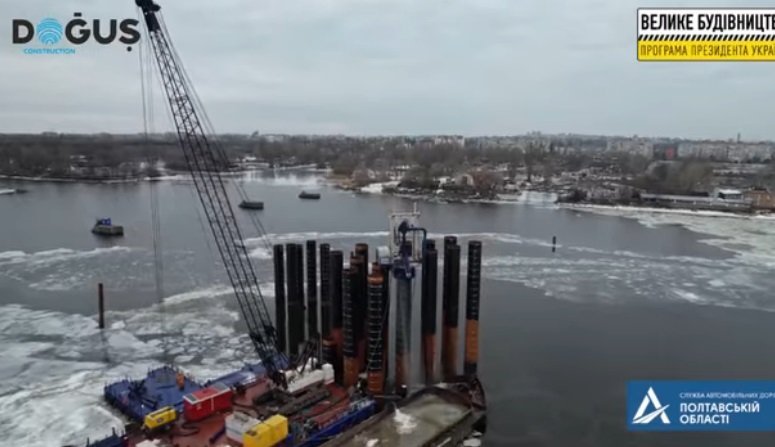 У Кременчуці під час будівництва нового мосту через Дніпро занурюють труби до проєктної відмітки за допомогою розбурювання скельних ґрунтів потужною установкою. Про це повідомляє Служба автомобільних доріг у Полтавській області.