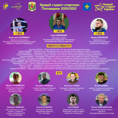 Кращим студентом-спортсменом Полтавщини 2020/2022 став Ігор Гавришко, чемпіон України, Європи та світу з гирьового спорту, студент Національного університету «Полтавська політехніка імені Юрія Кондратюка». Заслужений майстер спорту України, Майстер спорту України міжнародного класу.