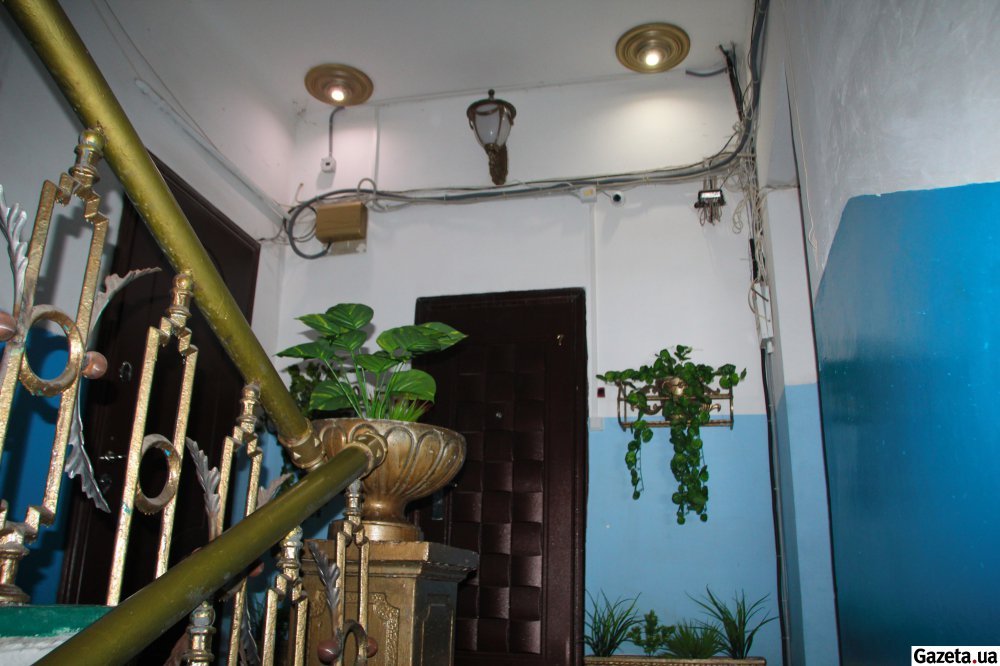 На краю сходового майданчика третього поверху на тумбі "сидить" фарбований золотом лев із картушем у лапах. Обабіч квартири встановлені бетонні чаші на тумбах, фарбовані в бронзовий колір. Над дверима світяться ліхтарі "під старовину". Пластикова коробка роутера на стіні фарбована в тон чашам. Водночас побілка стін і стелі потріскана, над входом до мініготелю висить неохайними шматками.